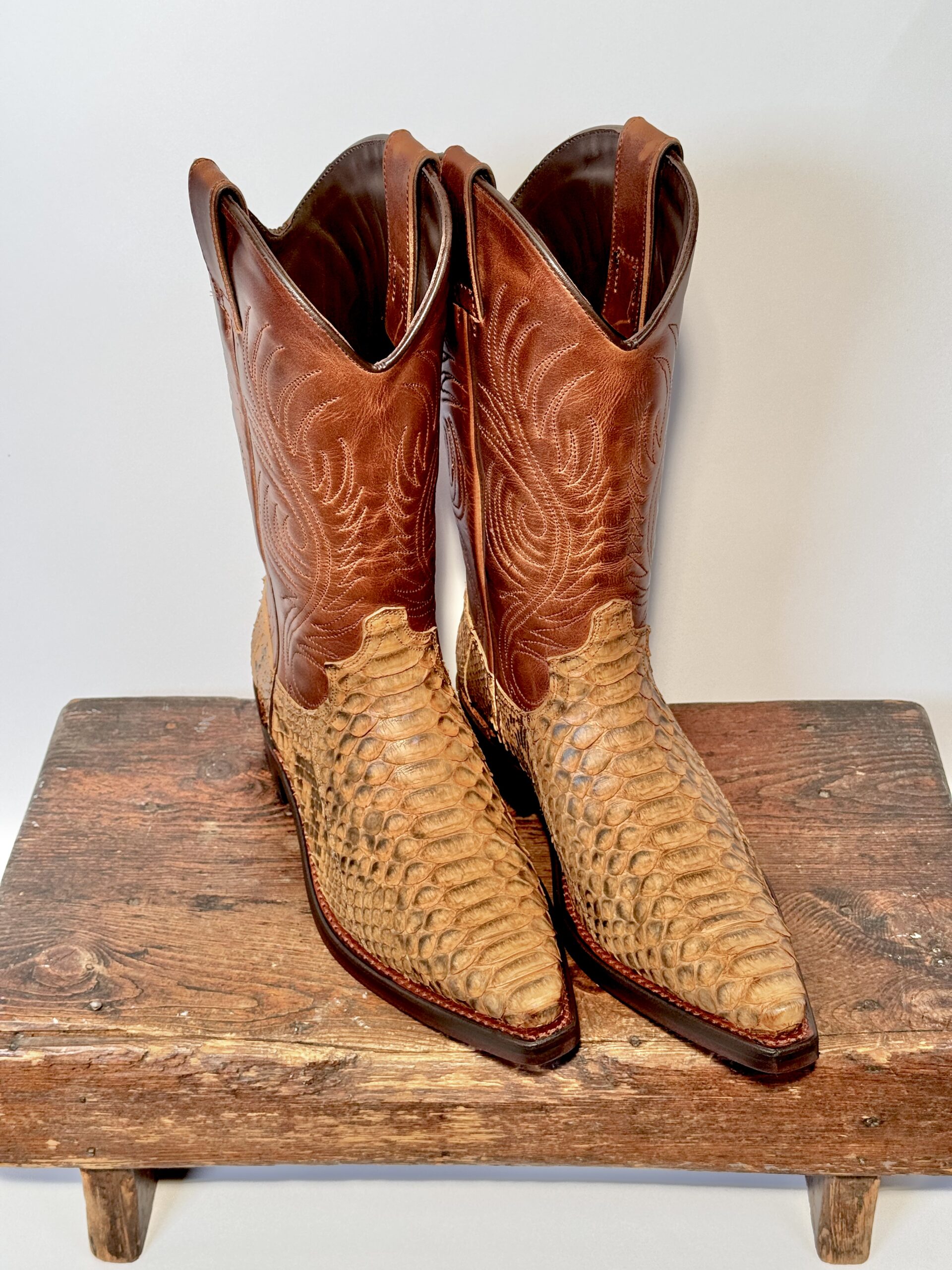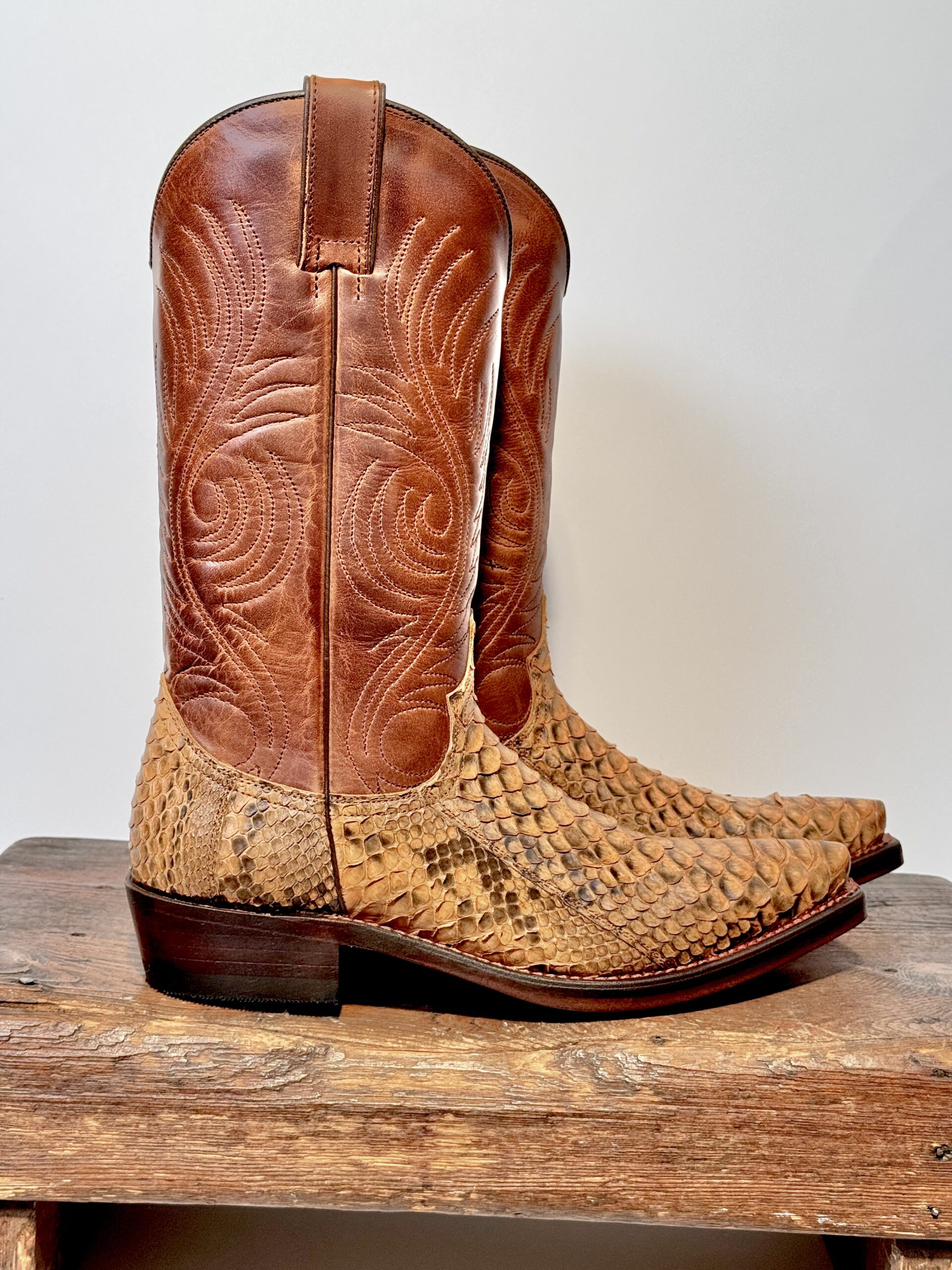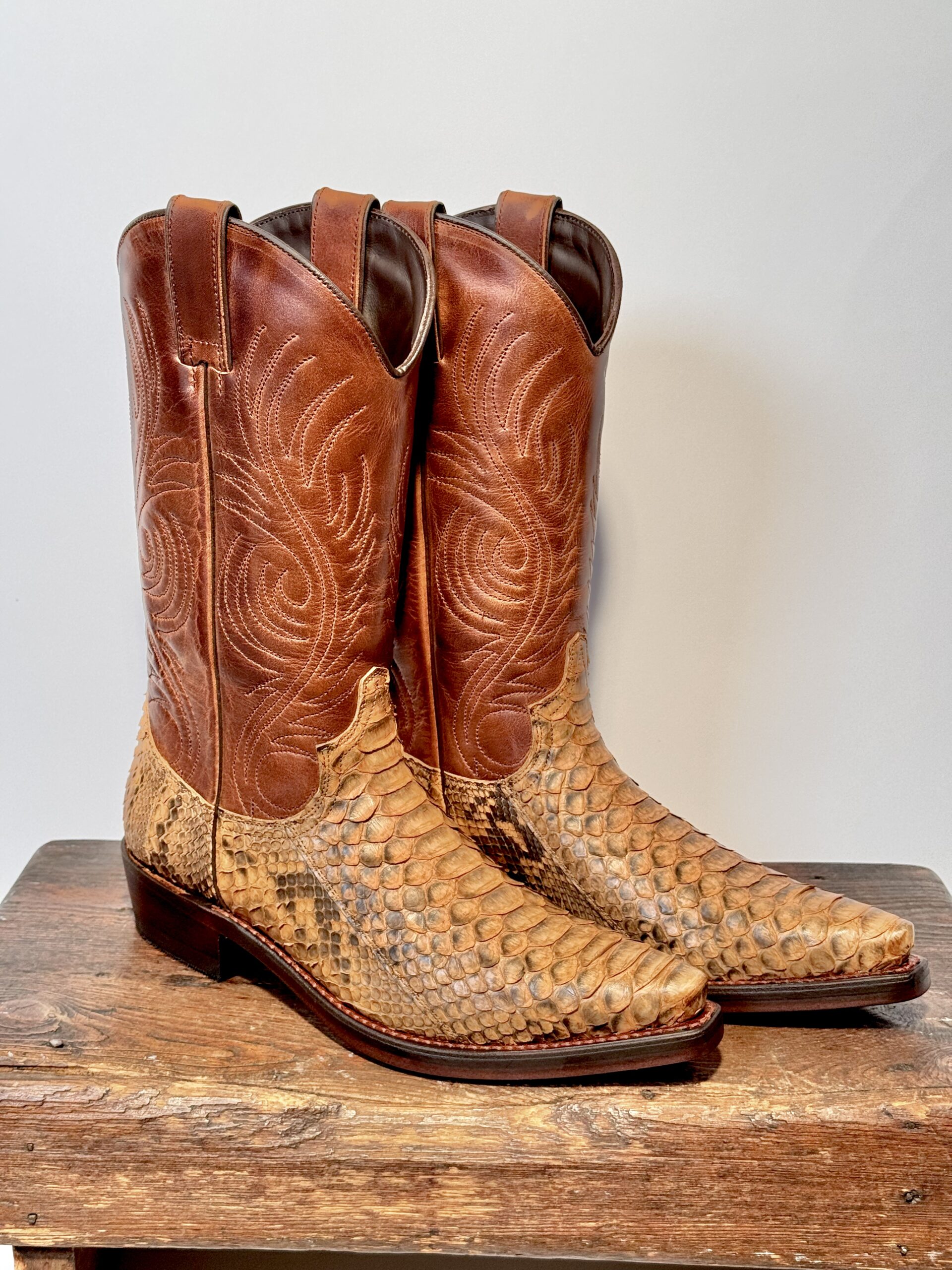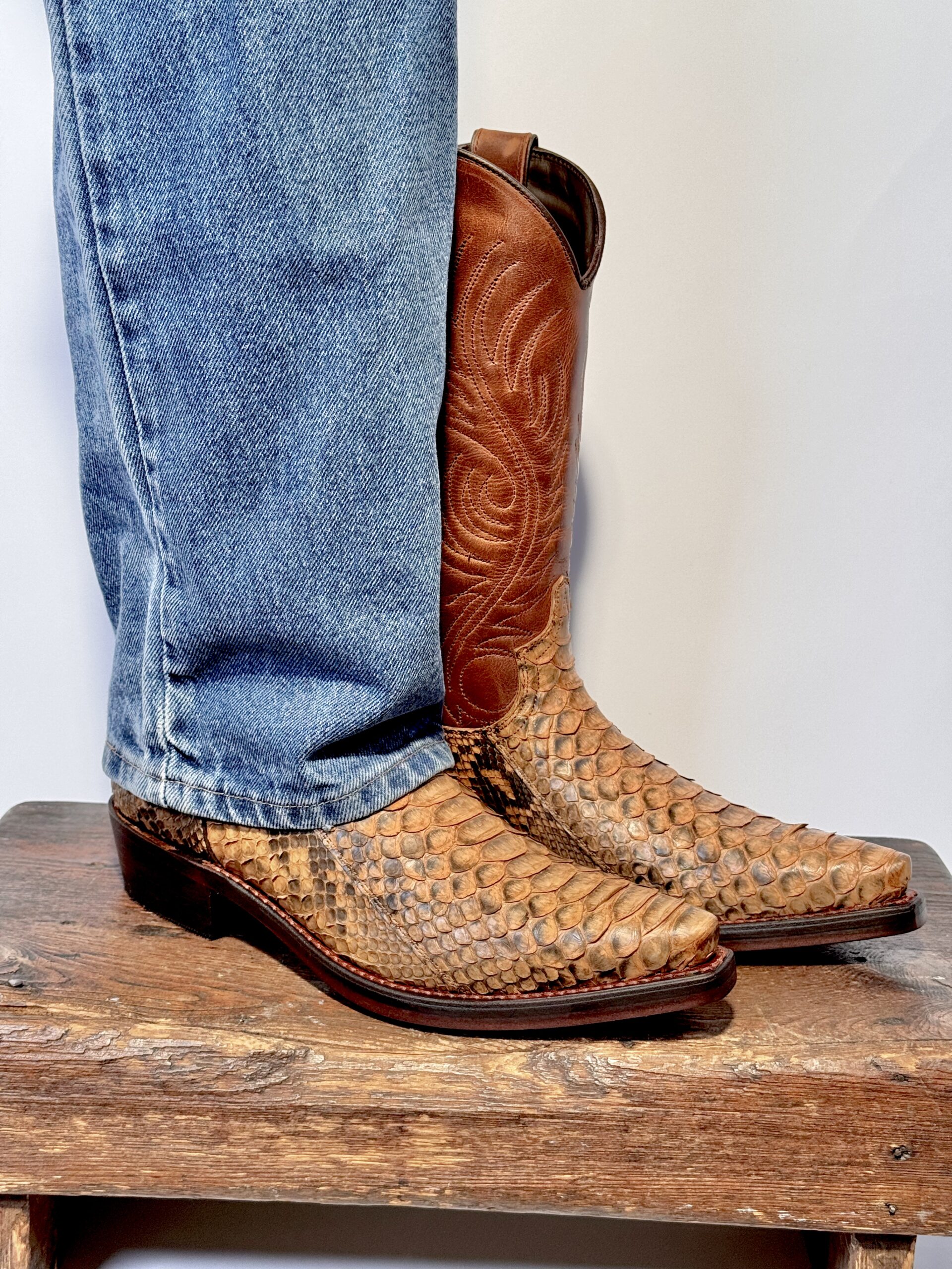 Vi tilbyder her en superfed westernstøvle i en eksklusiv kombination af python- og okselæder.